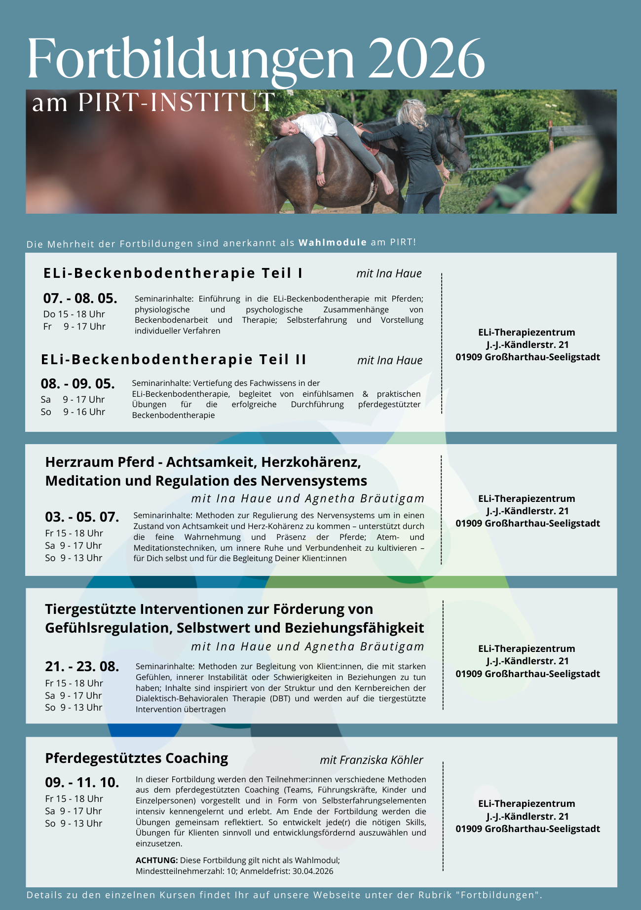 Das Angebot reicht vom Lehrgang zum Sachkundenachweis Pferdehaltung über tiergestützte Interventionen zur achtsamen Förderung von Gefühlsregulation, Selbstwert und Beziehungsfähigkeit bis hin zu Herzraum Pferd mit Achtsamkeit, Herzkohärenz und Meditation. Darüber hinaus freuen wir uns, in diesem Jahr erneut die  Kurse zur ELi®-Beckenbodentherapie sowie pferdegestütztes Coaching anbieten zu können.